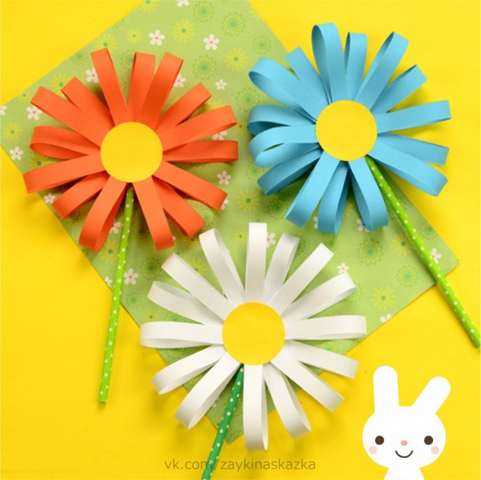Цветочки из бумажных полосок Цветочки из бумажных полосок, сделанные с любовью детскими руками, будут очень долго стоять в вазе как у мамы, так и у бабушки.