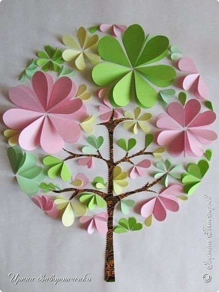Дерево: время года весна Дерево: время года весна Нам понадобится: цветная офисная бумага карандаш клей шаблоны сердечек Процесс: За основу возьмем бумагу формата А3. Рисуем круг (который потом будем заполнять), ствол (можно вырезать из бумаги). Начинаем наше деревце с крупных элементов. Затем поменьше....и еще меньше... По этому принципу заполняем весь круг.