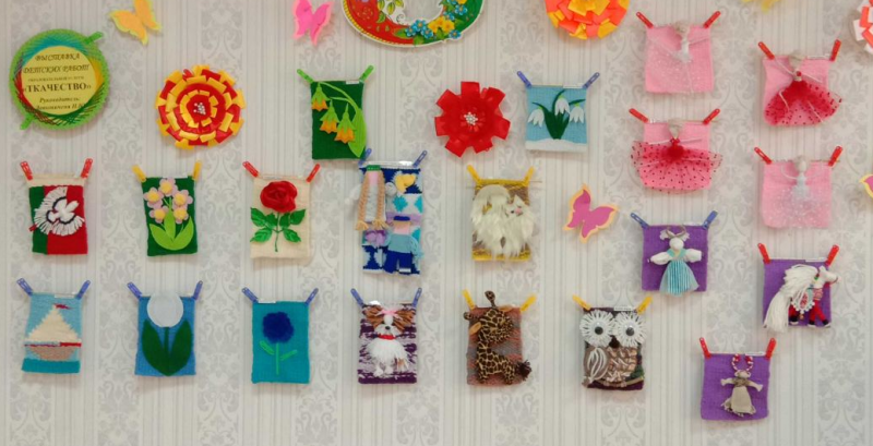 Тканые гобелены всё больше пользуются популярностью. Детские работы детей 5-6 лет на выставке 2021 года. Выполняются легко, дети справляются. Такие гобелены делаются за 8 часов. Это месяц для детей — по 2 занятия в неделю по часу. Декор на гобелене выполняется отдельно и пришивается к полотну.