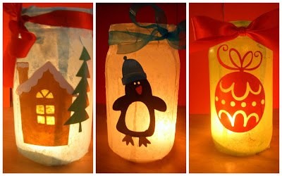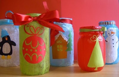 Обклейте гофрированной бумагой стеклянную баночку. Для этого нарежьте бумагу на длинные полоски, после чего, используя клей ПВА, обклейте ей баночку. Клей ПВА лучше развести водой в пропорции 1:1. Из обычной цветной бумаги вырежьте какую-нибудь новогоднюю картинку и наклейте ее поверх слоя гофрированной бумаги. Украсьте новогодний фонарик атласной лентой. Внутрь поместите свечку.