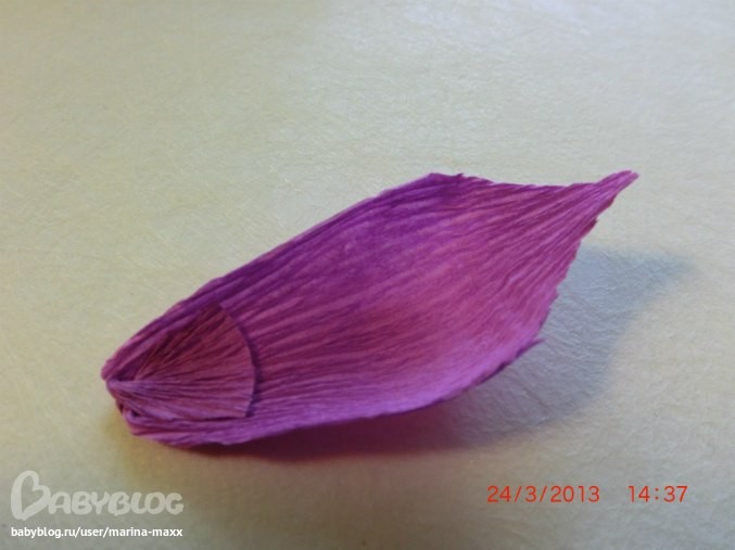 Шаг пятый: придаем форму лепестку. Для этого растягиваем в середине ближе к основанию лепестка. Вверзу не растягиваем, чтобы лепестки были острые. если верх лепестка как на фото получился не очень острый. то можно или подрезатьего с двух сторон, или просто сжать пальзами с краев.