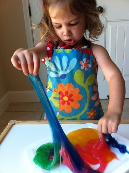Смешайте прозрачный ПВА клей и жидкий крахмал в равных количествах, перемешайте и разделите на порции. К каждой порции добавьте несколько капель пищевого красителя. Вымесите получившуюся массу до желаемой консистенции. Можно тянуть!