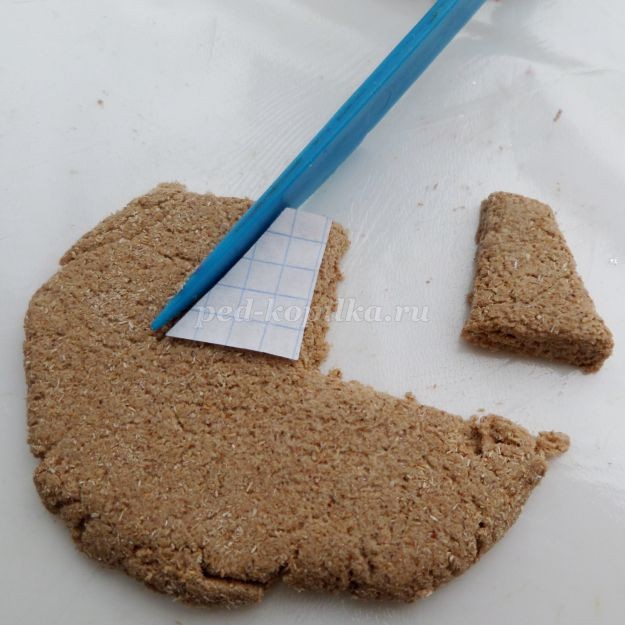 Хорошо примазать кистью, смазанной клеем ПВА.Доску обернуть пищевой плёнкой или вставить в прозрачный файл (для лучшего снятия заготовки). Тесто из опилок накрыть плёнкой и раскатать толщиной 0,5 – 0,7 см.