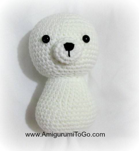 Голова и тело вяжутся одной деталью. Если Вы будете использовать глаза, которые надо закреплять изнутри, не забудьте прикрепить их между 12-ым и 13-ым рядами, расстояние между глазами – 7 сбн. Мордочку пришиваем, чтобы ее верхняя крайняя часть располагалась на 12-ом ряду.