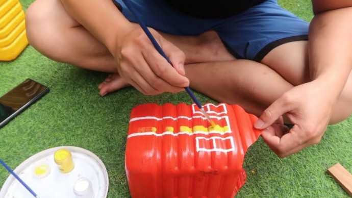 Покрасьте все бутылки акриловой краской. Нарисуйте окошки и двери.