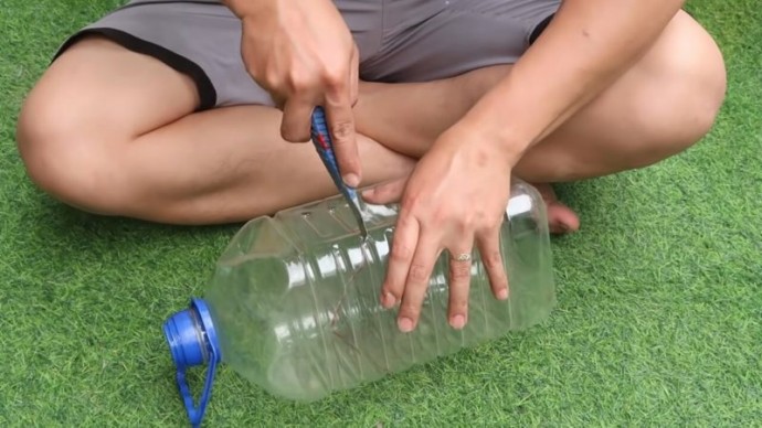 На 5-литровых бутылках наметьте с двух параллельных сторон крышу, обрежьте.