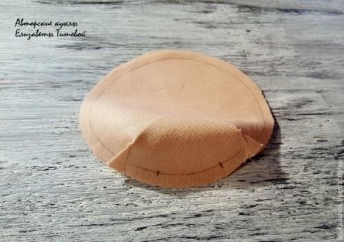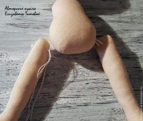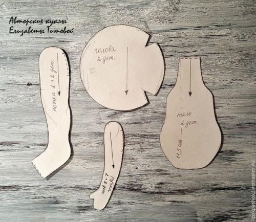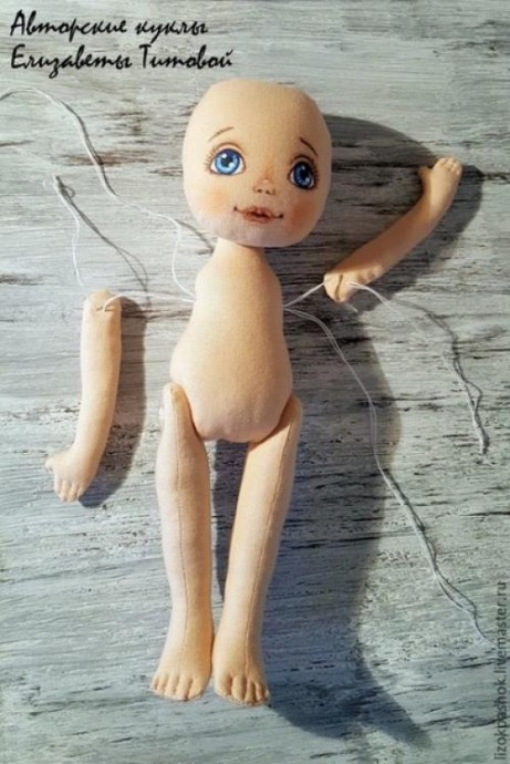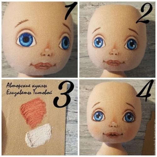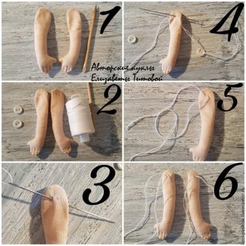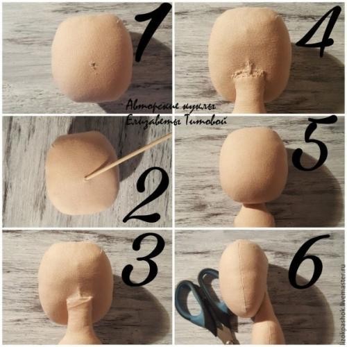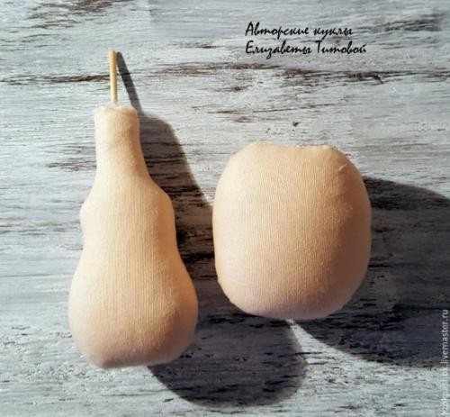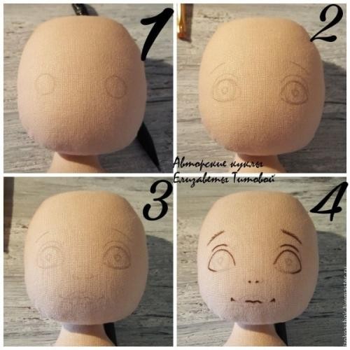 На детали тельца указан размер, так кукла получится 24-25 см. Пунктирными линиями отмечены места, которые зашивать не нужно. Обратите внимание на направление долевой нити (указано стрелками). Ткань складываем лицевой стороной внутрь и переносим детали выкройки. Я шила сразу две куклы. Мне хватило отреза 45 на 35 см. Оставляем припуски около 0,5см по периметру всех деталей, на шее 1см,на деталях головы 0,7-1 см. Прошиваем все детали, кроме головы, на швейной машине (длина стежка 1,5 мм), оставляем незашитыми отверстия для выворачивания. Вырезаем детали головы с припусками 0,7-1 см. На деталях головы сшиваем вытачки, складываем детали лицевыми сторонами внутрь и прошиваем по контуру, оставляя отверстие для выворачивания между вытачками. Вырезаем детали ножницами зиг заг или делаем насечки в местах скруглений. На ножках прошиваем мысочную часть. Выворачиваем детали. Очень плотно набиваем голову и тело. Зашиваем отверстие для набивки на голове. В шею вставляем бамбуковую шпажку острием вниз примерно до середины, отламываем шпажку, оставляя 1,5-2 см. Отломаный кусочек шпажки не выбрасывайте, он нам еще пригодится. Примеряем голову к телу, отмечаем место на затылке, куда будет вставляться шпажка. Делаем небольшое отверстие (фото 1). Оставшимся кусочком шпажки через это отверстие сдвигаем наполнитель вверх и в стороны, расправляем все заломы швов, если они есть. Можно добавить еще наполнителя при необходимости (фото 2). Одеваем голову на тело (фото 3). Пришиваем шею к затылку и далее по кругу потайным швом. Шов на шее скроется под волосами (фото 4). Вид спереди. За счет направления долевой нити форма головы получается вытянутой вверх. Если кроить голову с другим направлением долевой нити, то форма будет более широкая и короткая (фото 5). Вид сбоку. Тут видна форма головы, которая должна получиться (фото 6). Набиваем мысок и пятку на ножках. Исчезающим маркером рисуем пальчики на правой и левой ножке. Через отверстие для набивки вводим иголку с ниткой в линию пальчика и прошиваем мелкими стежками назад иголку, утягивая деталь. Прошиваем все пальчики. Ножки набиваем очень плотно и зашиваем отверстие для набивки потайным швом. Так же прошиваем пальчики на ручках. Для выворачивания и набивки ручек я использую маникюрную палочку (фото1). Набиваем ручки примерно до середины. Кладем ручки, как показано на фото, и отмечаем места крепления (фото 2). Крепкую нить в два сложения вдеваем в иглу, завязываем узелок. Вводим иглу в месте крепления и выводим в отверстие для набивки (фото3). Пришиваем пуговицу, вводим иглу через отверстие для набивки в место крепления с изнаночной стороны (фото 4). Подтягиваем нитку, прячем пуговицу внутрь ручки. Отрезаем кончик нитки с иглой. Пуговица должна быть внутри и два хвостика ниток с лицевой стороны, один с узелком, другой, более длинный, без узелка (фото 5). Аккуратно набиваем ручки до конца, совсем чуть-чуть. Зашиваем отверстие потайным швом. Должно получиться вот так (фото 6). Если вам кажется это сложным, можно набить ручки до конца и крепить их с пуговицами наружу, как ножки. Откладываем ножки и ручки. Переходим к росписи. Для росписи я использую минимум материалов и инструментов. Акриловые краски белого, черного, темно-синего (называется почему-то голубой) и небесно-голубого цветов, простой карандаш, мягкий ластик, кисти синтетика номер 4 и н