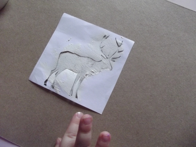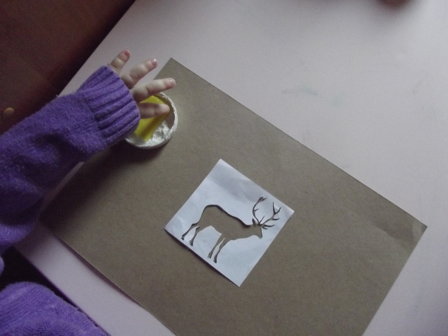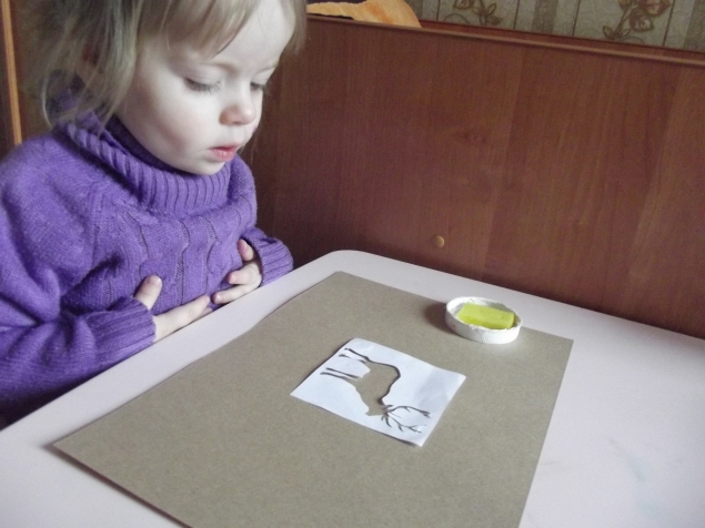 Дочка закрашивала картинку краской с помощью губки ( кисти ).
