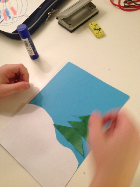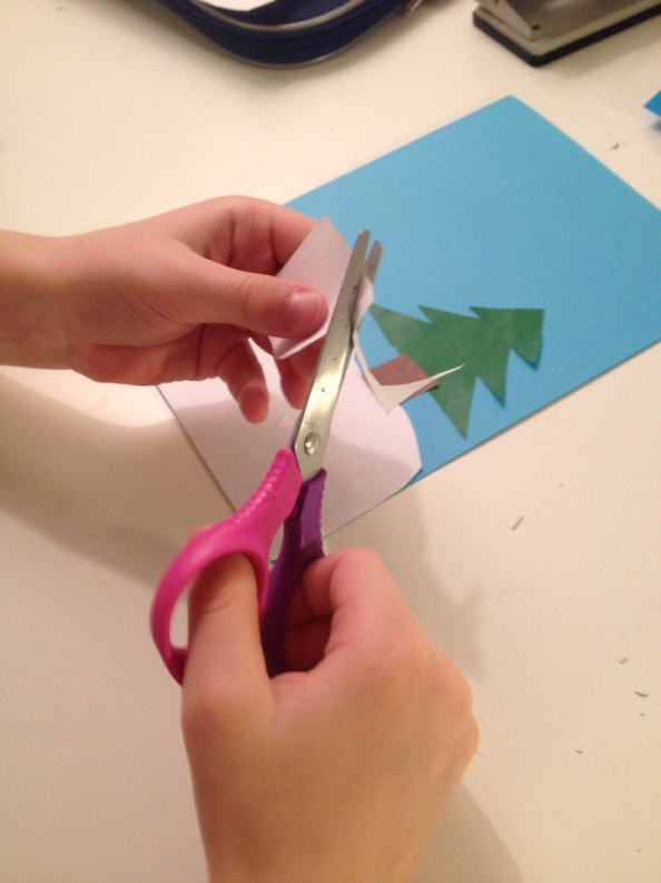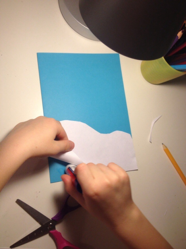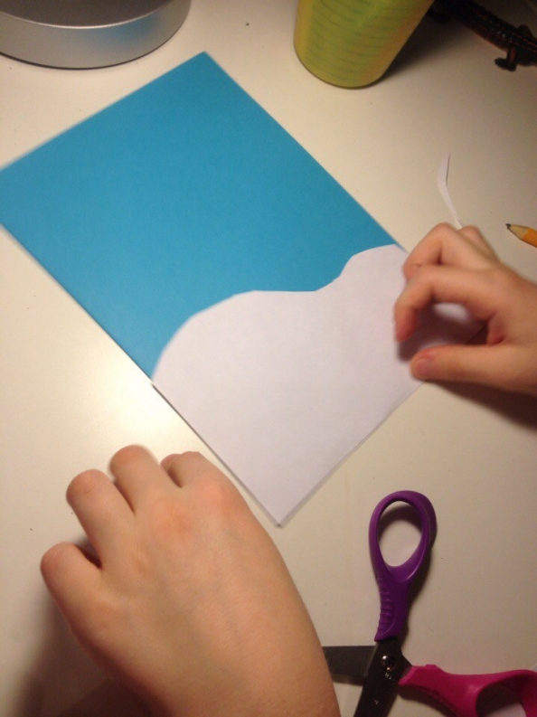 Вырезаем из белой бумаги сугроб и приклеиваем его на обложку.