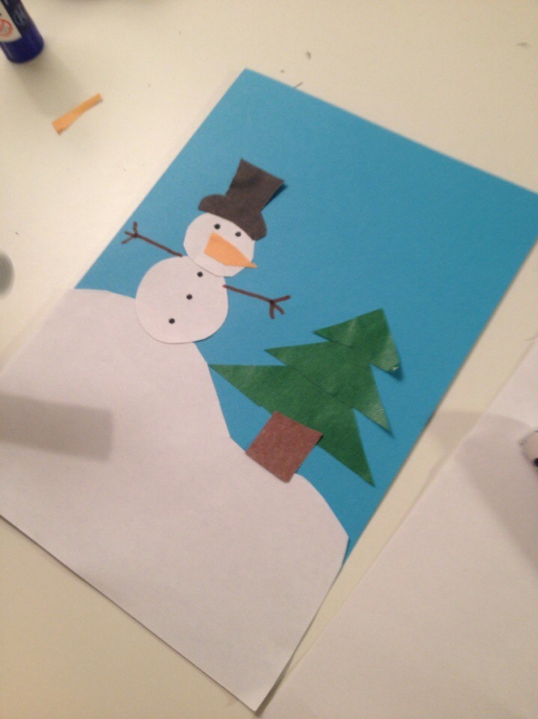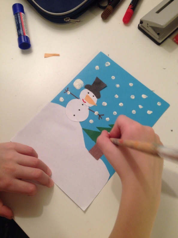 Наклеиваем снеговика, носик, шляпку. Фломастером рисуем глазки и ручки.