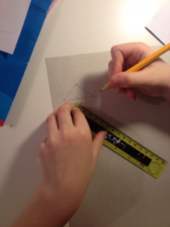 Теперь вырезаем елочку. Сын строил ровные треугольники по линейке, т.к. он у нас математик и очень любит точность во всем.