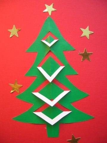 На листе бумаги для оригами зеленого цвета нарисуйте елочку. Сделайте на ней надрезы по линиям. Там, где располагается ствол елочки, вырежьте кусочек бумаги полностью. Если перед тем как делать надрезы, вы сложите лист бумаги пополам, то вырезать можно будет ножницами. В этом случае изготовление открытки будет под силу даже дошкольнику. Если же вы хотите обойтись без складки по центру открытки, то делать надрезы лучше специальным ножом для резки бумаги. Теперь вам осталось только загнуть уголки назад и наклеить вашу заготовку на картон.