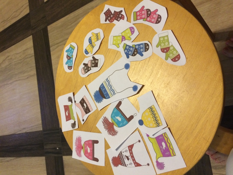 Я распечатала и разрезала разноцветные шапочки и варежки. А дочка искала каждой шапочке подходящие варежки.
