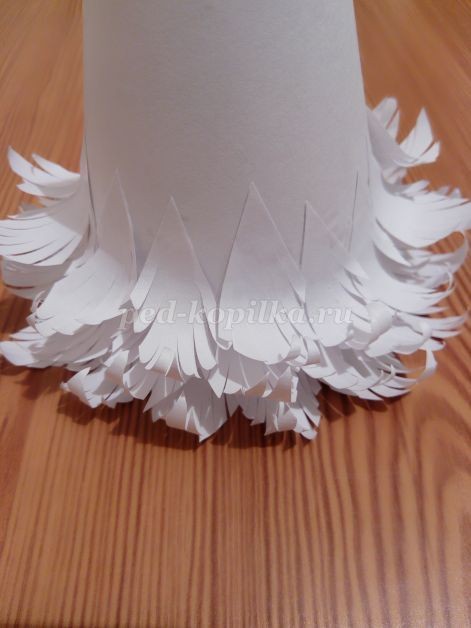 Приступаем к наклеиванию ромбов-перышек на конус елочки. Начинаем с самого низа первый ряд, приклеиваем половинку ромба.