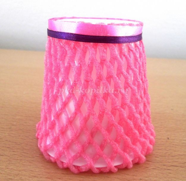 Приклеиваем клеем «Мастер». Верхнюю часть сеточки приклеить внутри стаканчика, нижний край отрезать. Низ вазочки украшаем тонкими атласными ленточками.