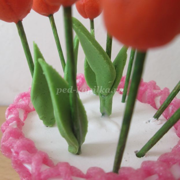 Закрепить при помощи клея ПВА сначала один листочек на стебле, затем второй.