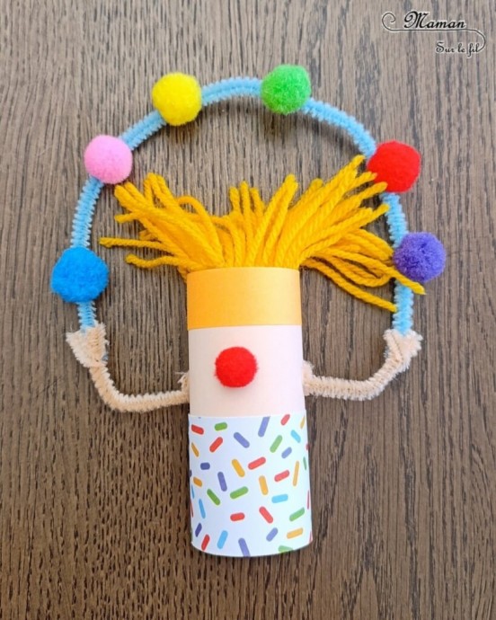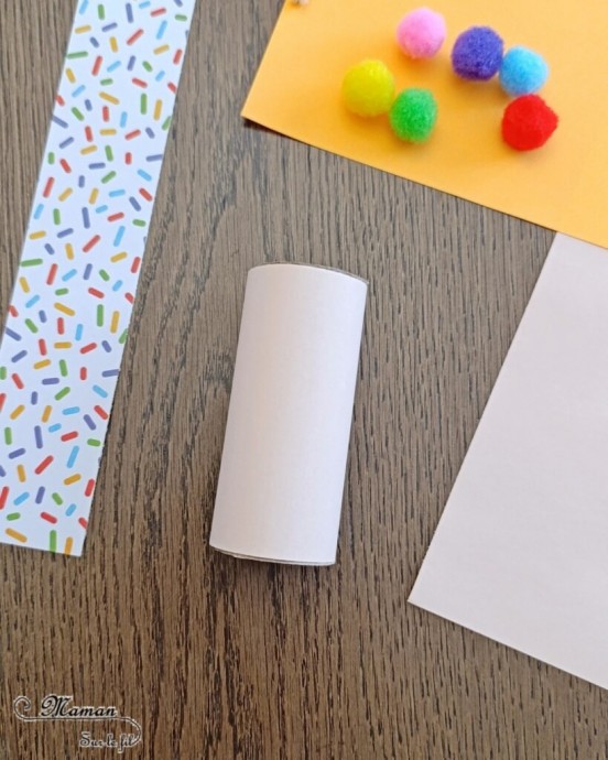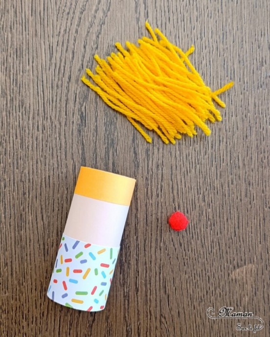 Для поделки вам понадобится: картонная втулка, цветная бумага, ножницы, скотч, маленькие разноцветные помпоны, желтая пряжа, клеевой пистолет, синельная проволока, маркеры.