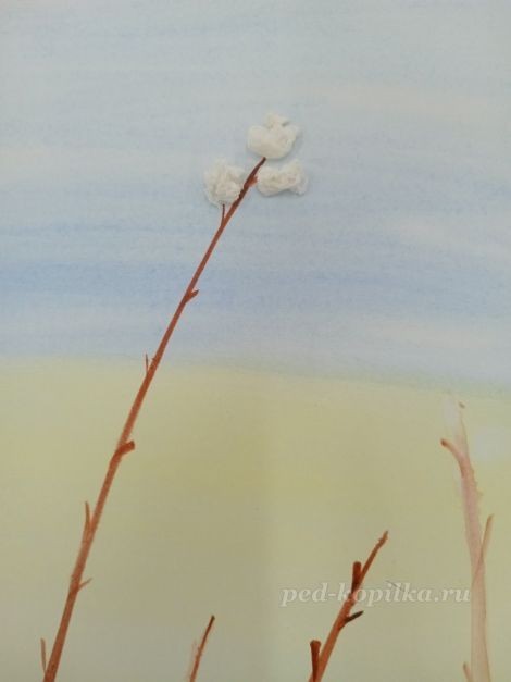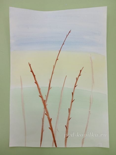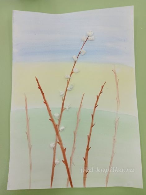 Предлагаю сделать три веточки.Сейчас нам нужно нарисовать ещё веточки между уже нарисованными. Но сделать их нужно светлее, полупрозрачными. На них мы вербочки не будем клеить, они нам нужны для полноты картины, представим, что они вдалеке.