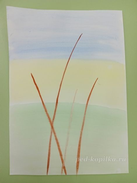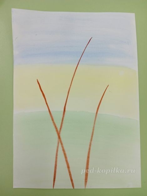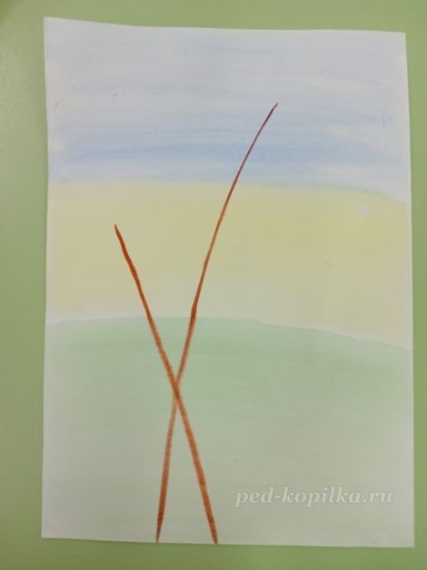 Фон высох, будем рисовать веточки. Возьмём тоненькую кисточку и нарисуем веточки. Для веточек будем использовать коричневую краску. Набираем краску на кисть и кончиком кисти ведём линию. Начнём линию чуть выше середины листа и поведём её вниз, до края листа примерно по середине. Вторую веточку начнём чуть левее первой и поведём её вниз, ближе к правому углу, веточки перекрещиваются.