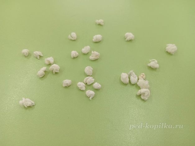 Вот какие красивые веточки получились! Нам нужно много белых комочков, ведь на вербе много пушистых цветочков. Пока сохнут веточки добавим немного цветочков вербы. Продолжим катать шарики. Вот шарики готовы.