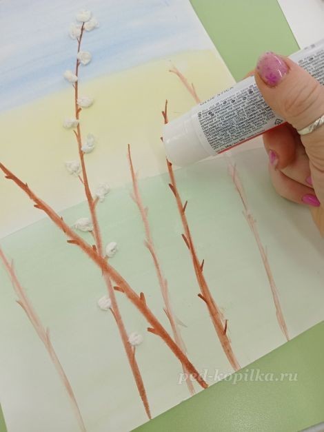 Будем их приклеивать. Наши цветочки вербы сделаны из салфеточки. Салфетки очень тоненькие и наносить клей на них не удобно. Предлагаю наносить клей на наш фон. Пробуем ставить точечку клеем-карандашом в том месте, где планируем приклеить цветочек. На место, которое нанесли клей прикладываем цветочек. Чуть ниже с обоих сторон от первого цветочка снова наносим клей и приклеиваем по одному цветочку.