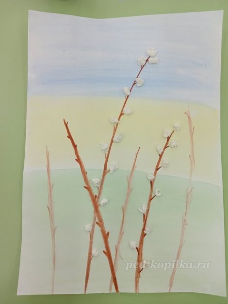 Приклеиваем первый шарик из салфетки. Затем вновь наносим клей и поочерёдно приклеиваем шарики на всю веточку.Вот и вторая веточка расцвела.