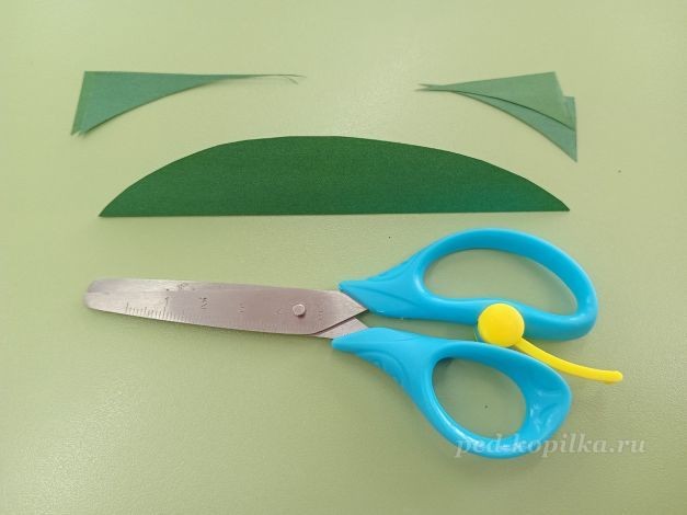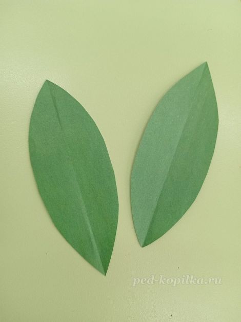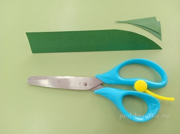 Начнём работу с того, что вырежем листочки из зелёной цветной бумаги. Для листочков у нас на столе приготовлены два прямоугольника зелёного цвета.