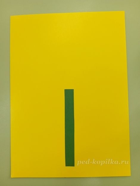 Сейчас приклеим на основы стебелёк и листочки. Положите перед сбой основу вертикально. Возьмите тоненькую полоску зелёной бумаги – это стебелёк. Нанесём на него клей. Приклеим его на основу.Начинаем прикладывать к самому краю листа по середине, снизу вверх. Проглаживаем руками.