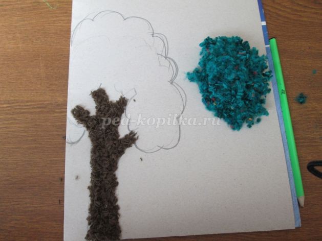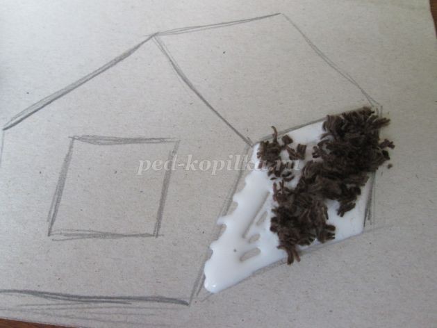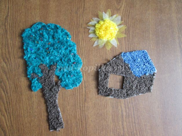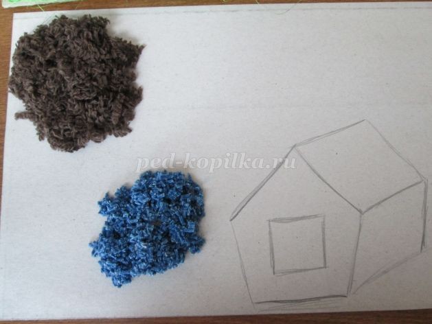 Затем, уже на лицевой стороне располагаем «полянку» из сизали. Так как сизаль неравномерна по фактуре, я вырезала два слоя одинаковой формы и последовательно приклеила их друг на друга.Для оформления сказочного панно нам понадобится изготовить дерево, под которым будет прятаться волк, домик для большого семейства козы и солнышко. Все эти объекты изготавливаются по одному и тому же принципу: рисуем на картоне необходимый объект – например, домик. Мелко нарезаем пряжу нужного цвета – в моем случае - коричневый и голубой.