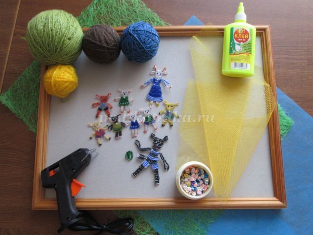 Материал: рамка для фото формата А3, зеленая сизаль, голубая оберточная бумага, ткань различной фактуры для изготовления солнышка (сеточка, органза), ножницы, картон, клей ПВА, пряжа синего, коричневого, зеленого и желтого цвета, пайетки, коза, волк, семеро козлят созданные ранее в технике бисероплетения, клеевой пистолет, крючок для вязания.
