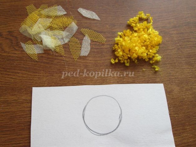 Затем равномерно наносим клей ПВА на картонную основу и плотно засыпаем её мелко нарезанной пряжей.