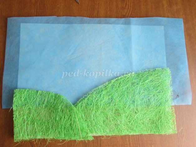 Для «неба» я взяла оберточную бумагу для цветов (к сожалению, не знаю, как она называется, но по фактуре очень похоже на тонкий флизелин), а для «полянки» очень хорошо подошла сизаль зеленого цвета.С помощью клеевого пистолета закрепляем лишние концы с обратной стороны.