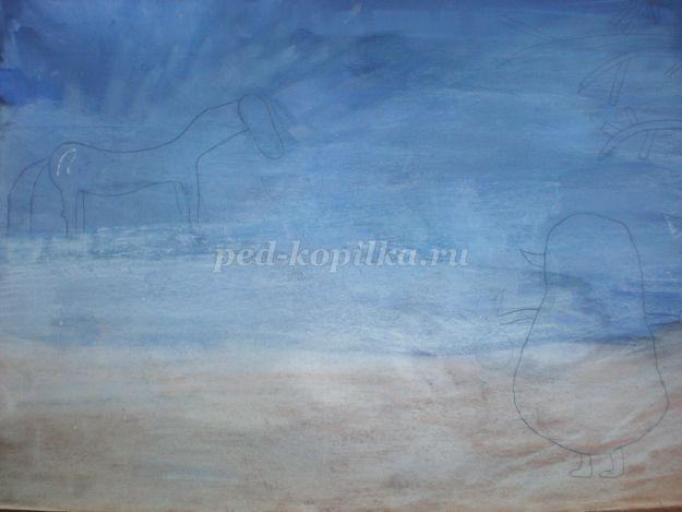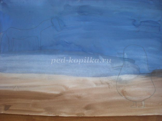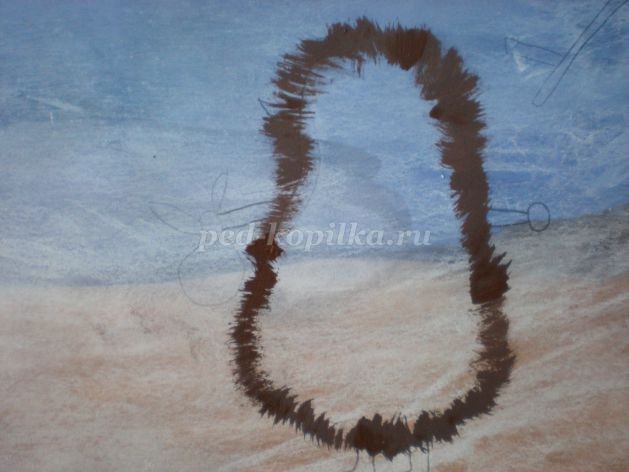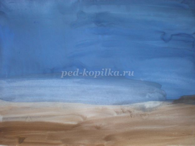 Тонируем темно синей гуашью половину листа, вторую половину коричневой гуашью.