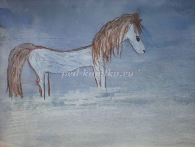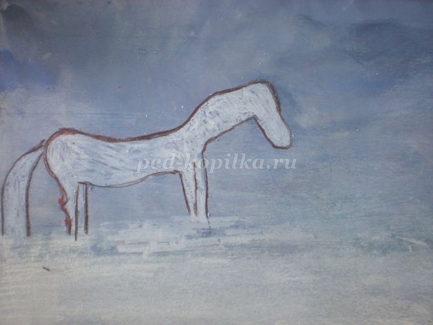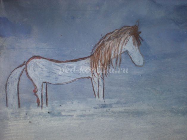 Белой пастелью раскрашиваем лошадь, и обводим контур коричневой пастелью.