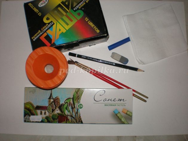 Дорисовываем дерево справа, и слегка рисуем пастелью туман.