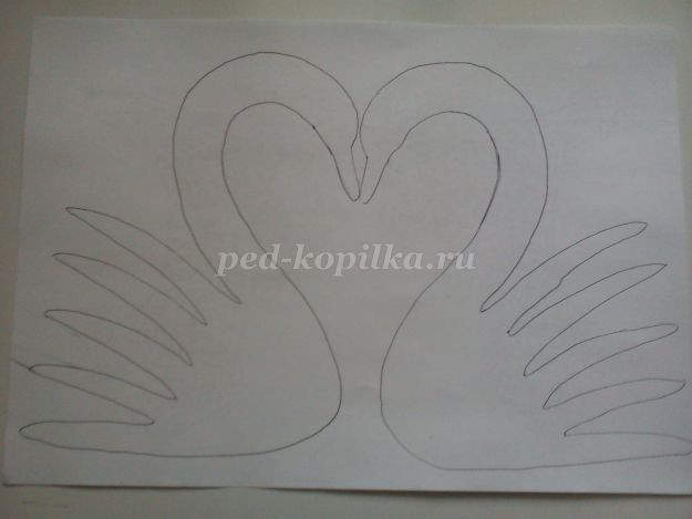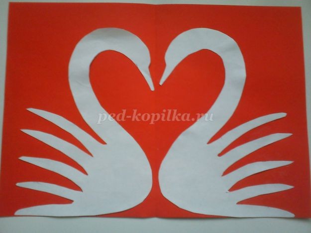 Вырежем двух лебедей и наклеим на лист красного картона, согнутого пополам.