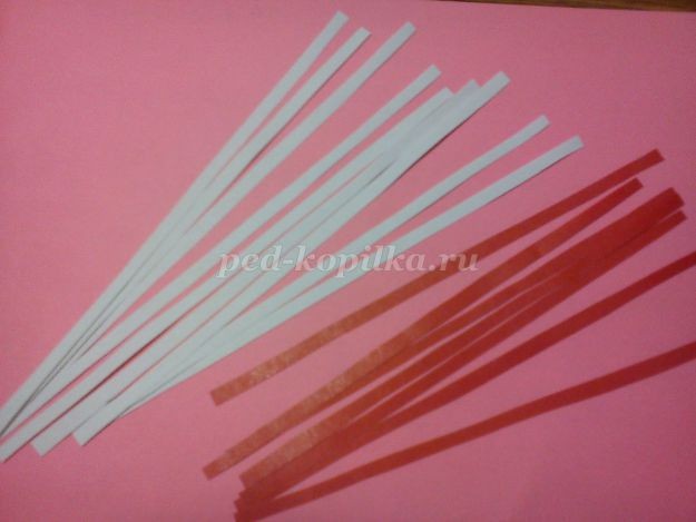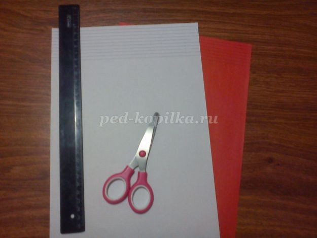 Берём лист белой и красной бумаги. Расчертим листы с помощью линейки на полоски по 0,6 см.