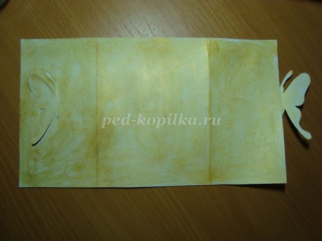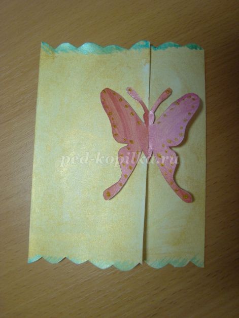 Бабочку – розовым цветом. После высыхания по контуру бабочки наносим золотые точки. Чтобы сложить открытку, согните по линии сгиба, проденьте бабочек в пазы, открытка закроется на "замочек". Края открытки можно фигурно обрезать вручную или фигурными ножницами. Открытка готова.