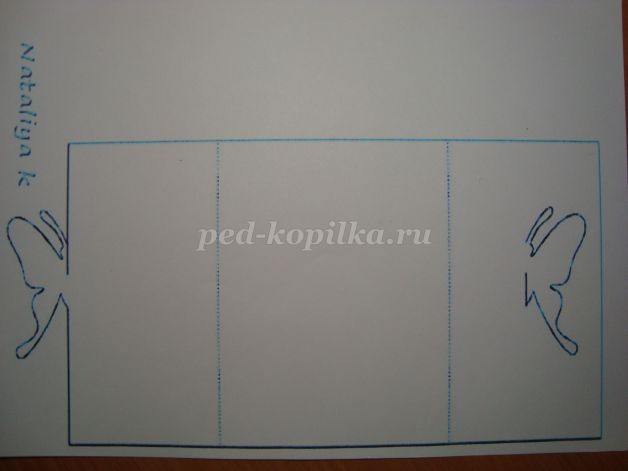 Шаблон для открытки из интернета. Переводим шаблон на бумагу. Пунктирные линии – места сгибов. Вырезаем открытку по контуру и бабочку внутри.