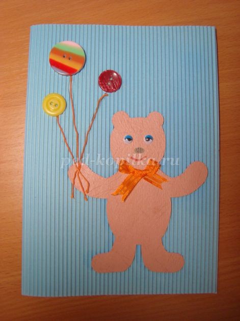 Приклейте картинку на гофрокартон. Пуговки – клеем «Момент». Приклейте веревочки для воздушных шариков. Мишке приклейте глазки, бантик. Нарисуйте нос и рот.