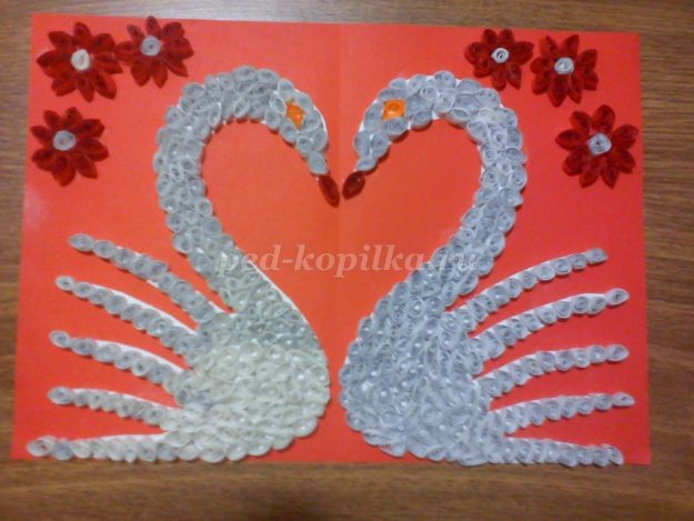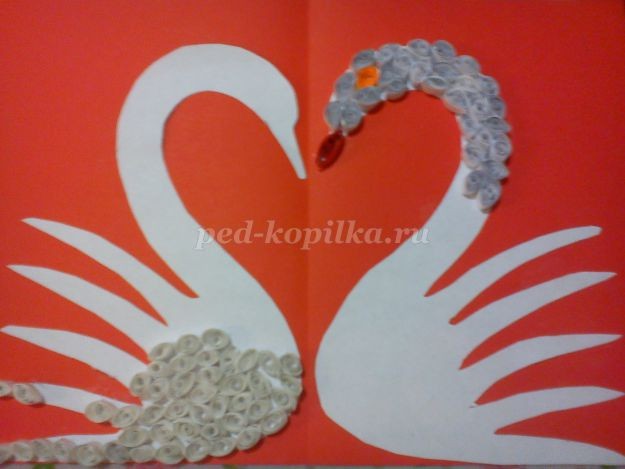Из фигур выкладываем белых лебедей и приклеиваем к открытке.
