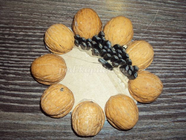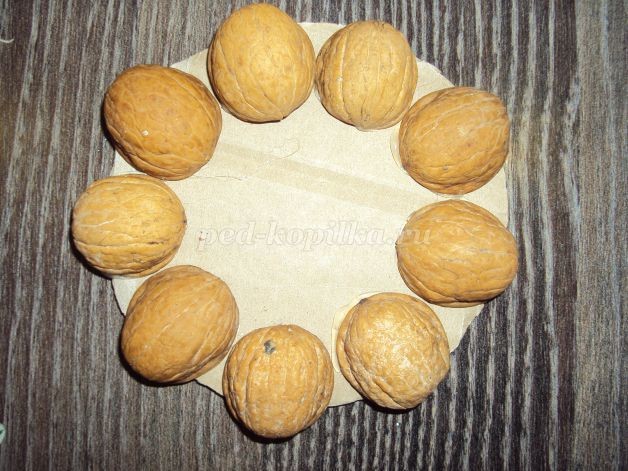 Вырезать круг из картона диаметром 10-12 см. Наклеить на него по кругу скорлупу половинки грецкого ореха.(Использую клеевой пистолет,можно на клей "Титан")