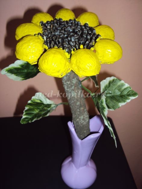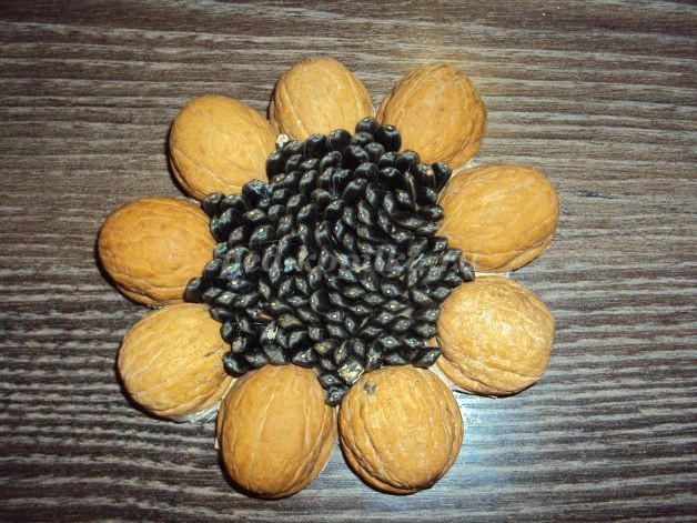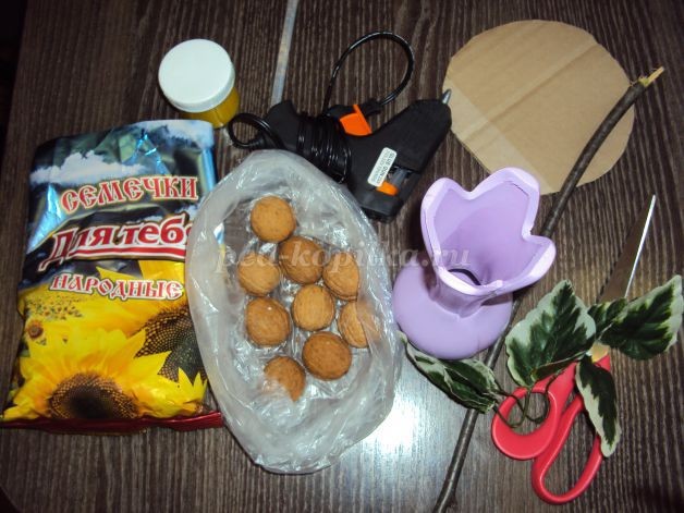 Оборудование: гуашевые краска желтого цвета, кисточки, клеевой пистолет, картон (вырезать круг диаметорм 10-12 см), ножницы, ветка от дерева для стебля,семечки,скорлупа грецкого ореха (половинки 8-10 шт), листья искусственные.