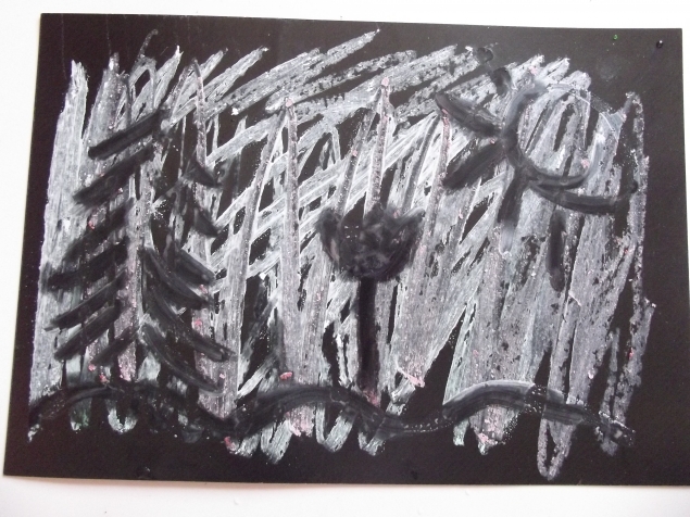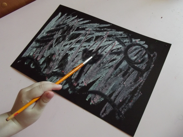 Рисуем мелками для асфальта . Закрашиваем ими лист картона , а потом рисуем на нем мокрой кистью .