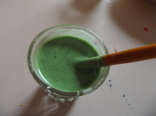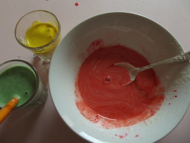 Мука + пищевая сода в пропорции 1:1.Разводим смесь водой до состояния сметаны и подкрашиваем акварелью .