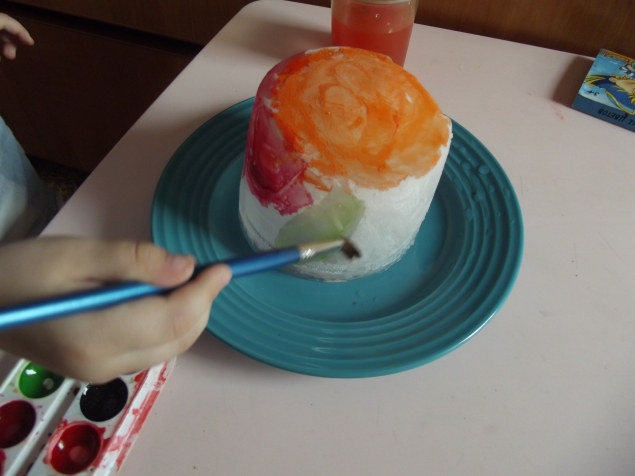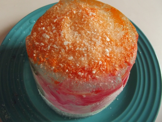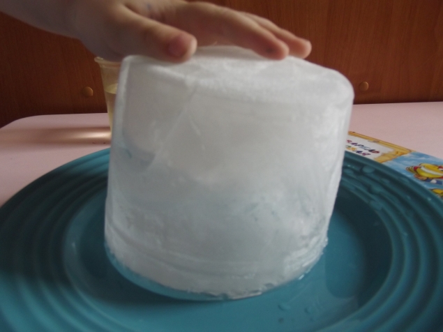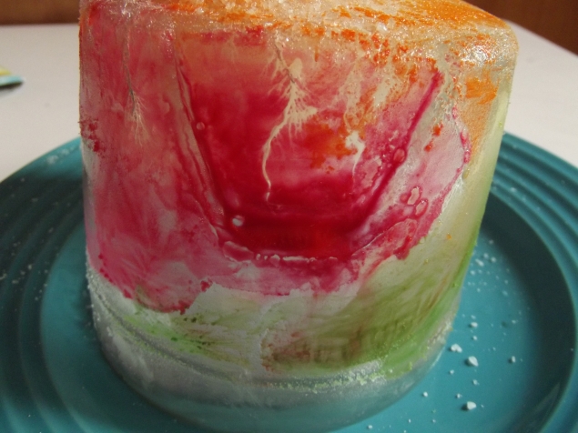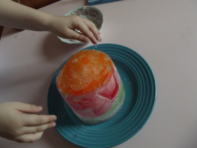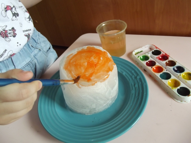 Раскрашиваем лед акварелью и посыпаем солью . Благодаря соли на льду появляются красивые разводы .