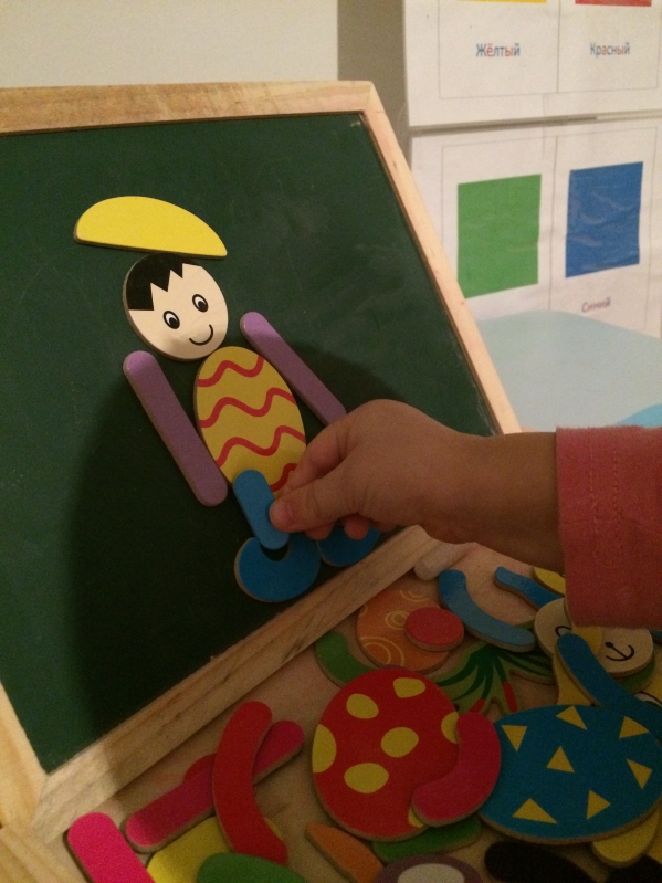 А мы с дочкой еще играем вот в такую магнитную игру. Здесь тоже разнообразные фигуры, из которых можно создать картины.