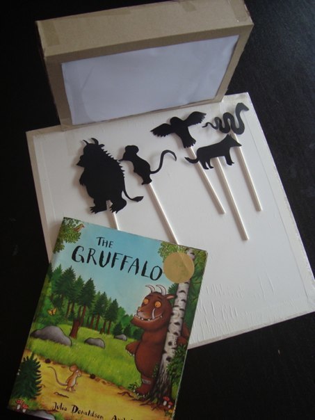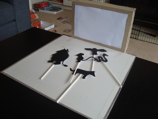 Приклейте театр двусторонним скотчем к торцу стола или табурета. Важно, чтобы внизу было достаточно места для детей.