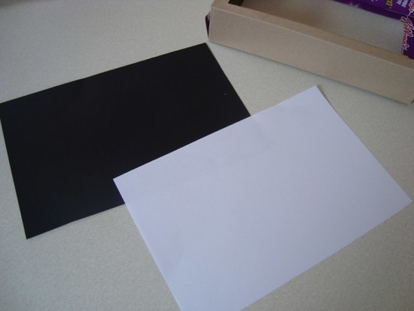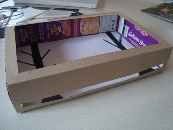 На лист белой бумаги наклейте фигуры деревьев из черного картона, а сам лист вклейте внутрь коробки.