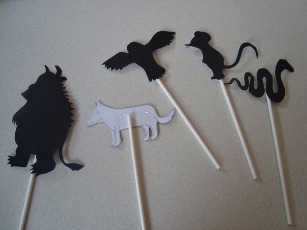 Фигурки актеров вырежьте из черного картона и приклейте к ним скотчем с обратной стороны кончики шпажек.